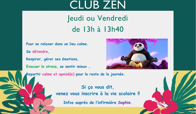 Le CLUB ZEN ouvre ses portes au collège sur le temps de la cantine (de 13h10 à 13h40) :